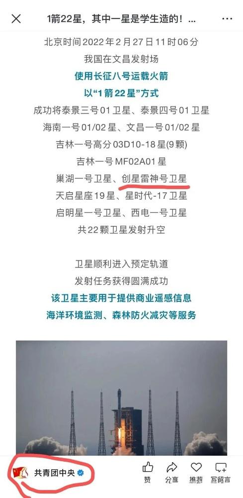 2022年2月27日11点06分,海南文昌发射场。长征八号火箭轰鸣升空,22颗卫星划破天际。在央视新闻的播报中,一个名字格外醒目——“创星雷神号”。