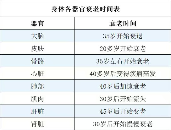 有的朋友觉得衰老是从60多岁开始的,其实,身体器官机能的衰退从某一个时段就已经开始了。
