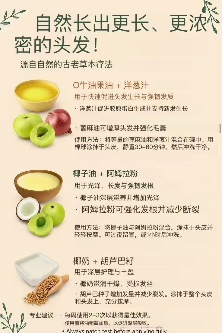 🌿让头发更浓密、更长的自然秘诀——古老疗法的佐证! ✨PROUD AGERS2025-11-07保健养生/护肤与养颜12 🌿让头发更浓密、更长的自然秘诀——古老疗法的佐证! ✨ 别再迷信昂贵的精华液了——你的厨房里就藏着真正促进头发生长的魔法! 🧅蓖麻油+洋葱汁促进胶原蛋白生成,强健毛囊,加速毛发再生。 🥥椰子油+余甘子深层滋养头皮,增加光泽,减少断发。 🥛椰奶+胡芦巴滋润干燥发丝,恢复头发蓬松度,减少脱发。 未经允许不得转载:傲时派 PROUD AGERS » 🌿让头发更浓密、更长的自然秘诀——古老疗法的佐证! ✨