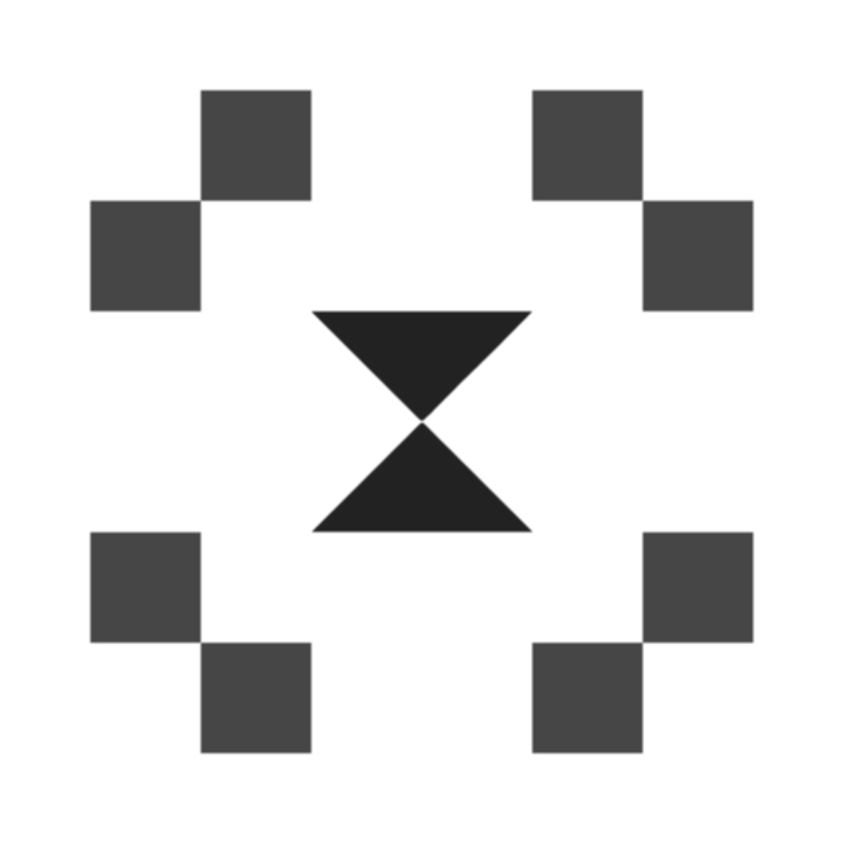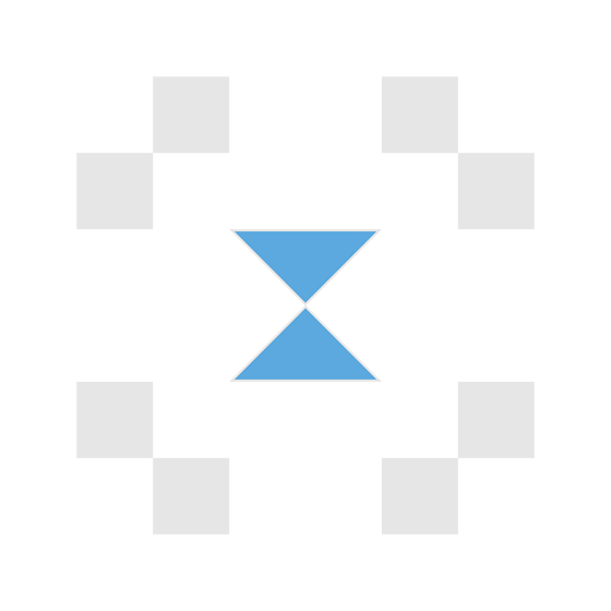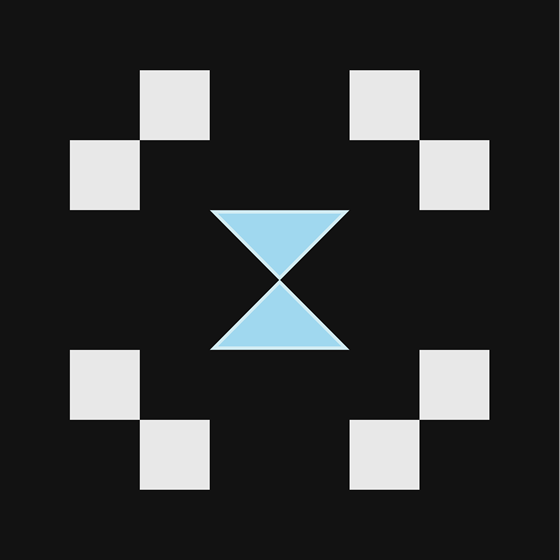 在一个由36个(大小完全一致的)正方形方块组成的宫格里,去掉(隐去)28个多余的方块,只在四个边角位置留下2个对称相邻的方块,在宫格左右上下居中的位置,制作一个由两个全等等腰直角三角形上下对置而成的时间沙漏,时间沙漏的大小,刚好占用居中4个方块大小的位置,见下图: