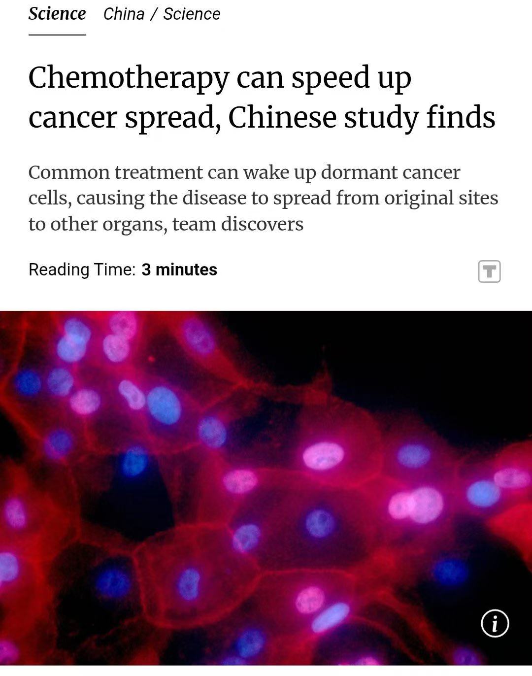 中国科学家团队发现,化疗会激活休眠的癌细胞,从而导致癌症从原发肿瘤部位扩散到远处器官。