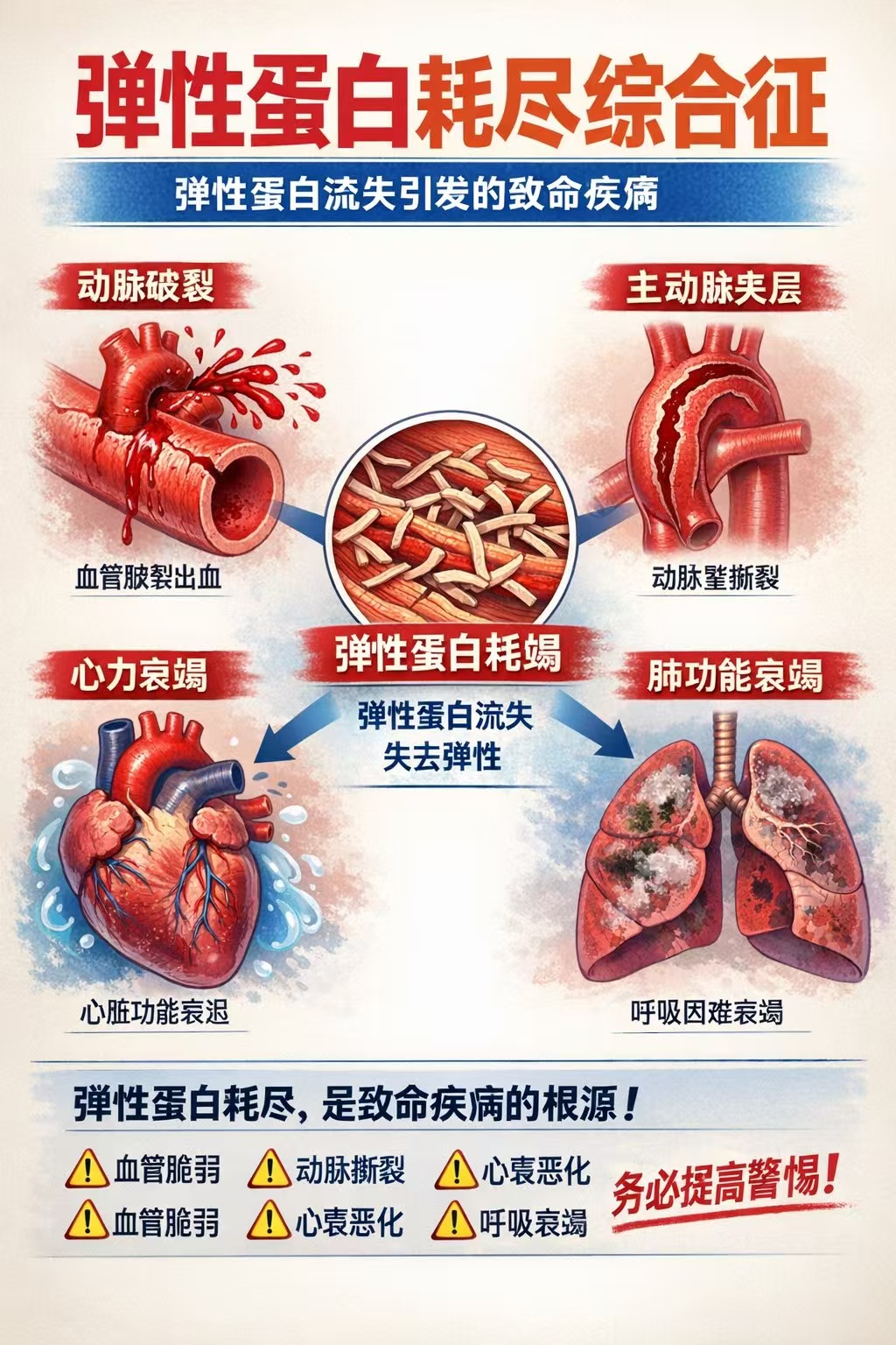 健康与衰老:弹性蛋白减少 → 组织功能下降 → 与皮肤老化、血管硬化、肺功能衰退等密切相关