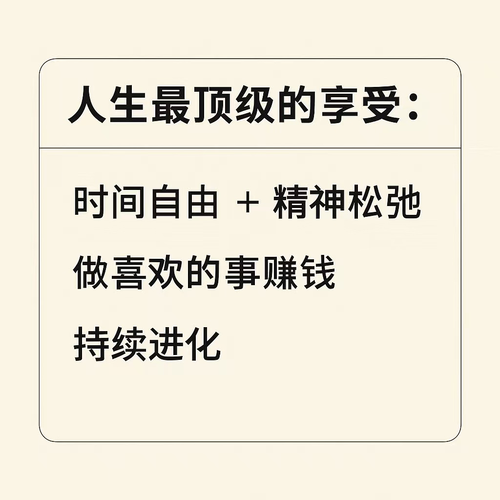 人生最顶级的享受PROUD AGERS2026-01-13大千世界31 人生最顶级的享受,其实不是更大的房子或更贵的车,而是这 7 件事: 1 . 时间自由 不用被闹钟叫醒,不用为谁的情绪加班。 2 . 做喜欢的事还能赚钱 兴趣 × 能力 × 需求 → 生活变成正反馈循环。 3 . 精神上不依附任何人 不讨好、不证明、不内耗。 4 . 身边有人真正理解你 不是很多,但足够真诚。 5 . 持续进化 一年比一年更强,而不是在重复同一天。 6 . 能说“不” 选择权比结果本身更奢侈。 7 . 你创造的东西能留下痕迹 作品、思想、影响力,而不是消失在人群里。 顶级享受不是拥有更多,而是越来越“无需拥有”。 未经允许不得转载:傲时派 PROUD AGERS » 人生最顶级的享受
