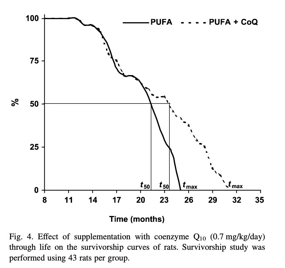 服用少量辅酶Q10的动物的最大寿命也明显更长(+24 %) 。